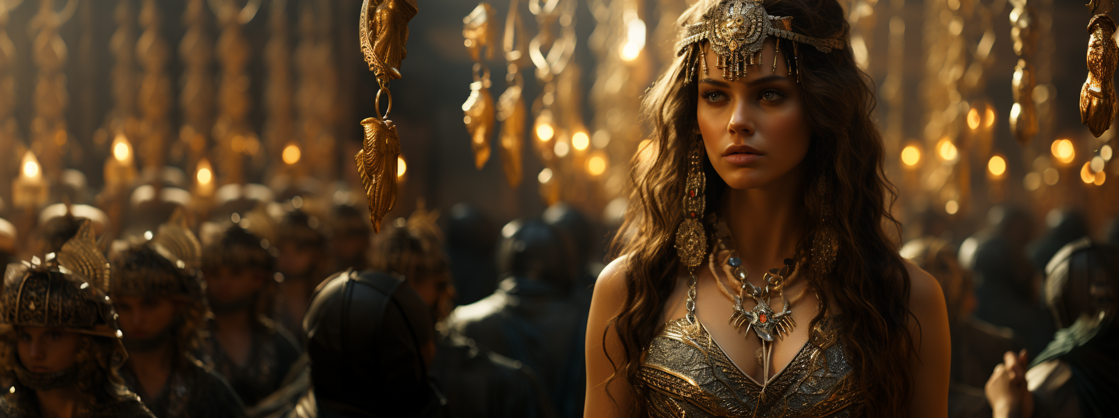 Cinematic still from the Bible, A moving representation from the Bible, Jezebel, queen of Israel, in an opulent palace chamber, surrounded by ornate idols of Baal and Asherah. She stands in the center, her eyes filled with a fervor that borders on fanatici